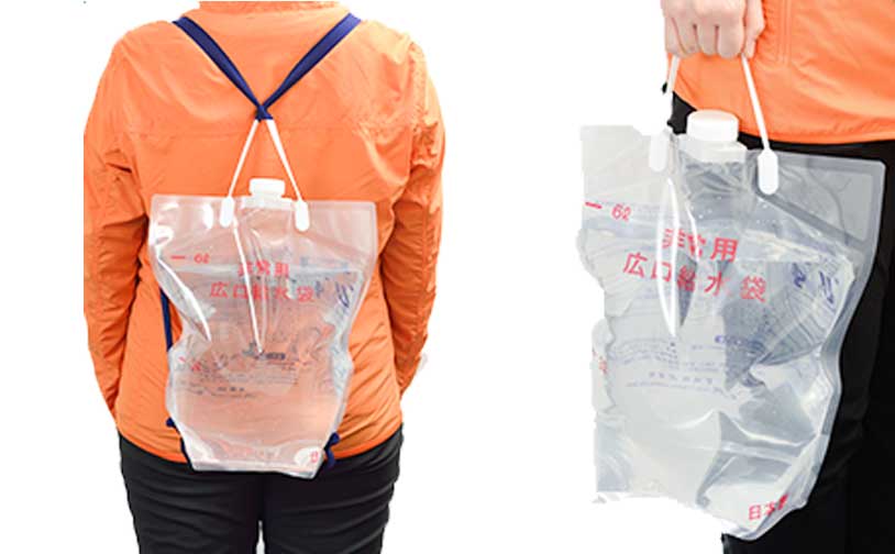 背負い式、手提げ式の両方で使える給水袋。